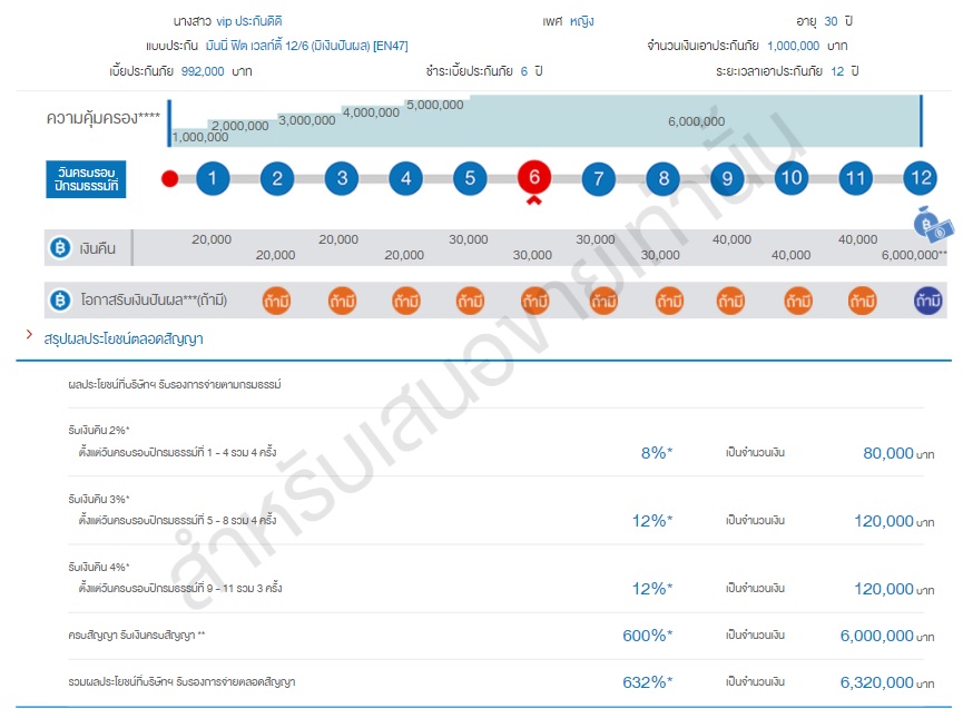 ปีที่ 1 คุ้มครอง 100%*, ปีที่ 2 คุ้มครอง 200%*, ปีที่ 3 คุ้มครอง 300%*, ปีที่ 4 คุ้มครอง 400%*, ปีที่ 5 คุ้มครอง 500%*, ปีที่ 6-12 คุ้มครอง 600%*